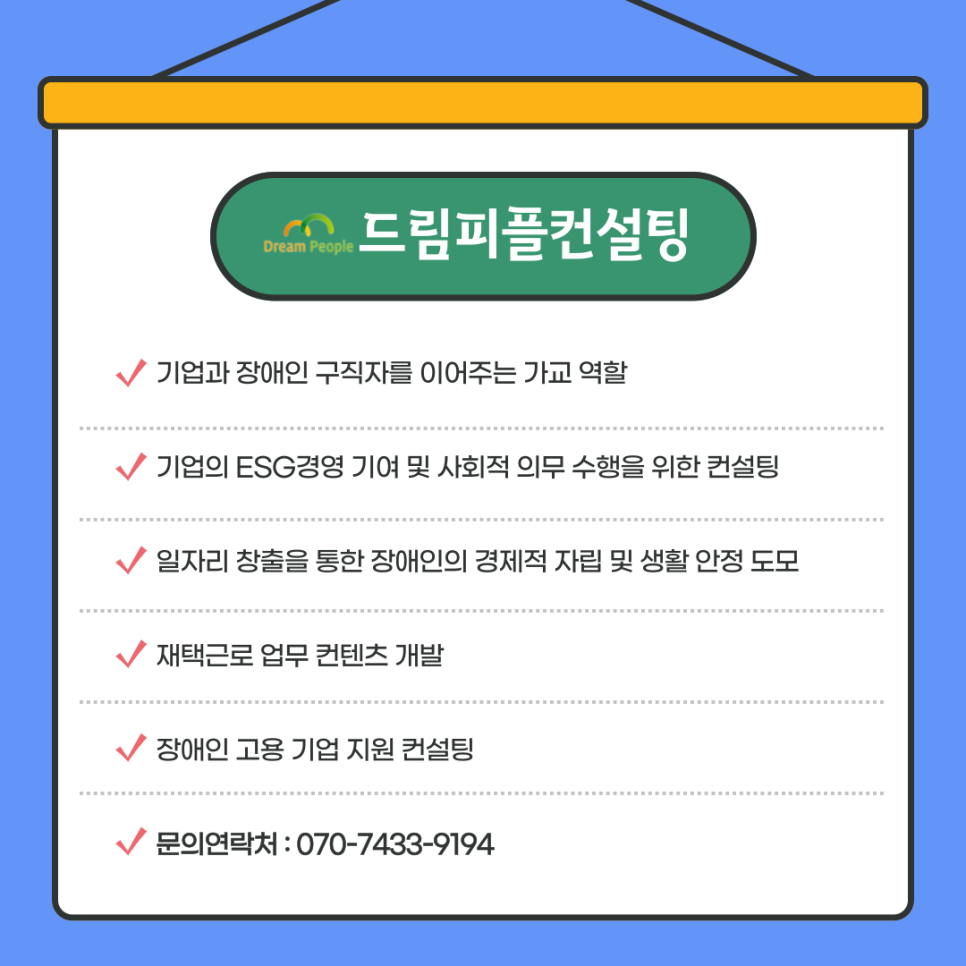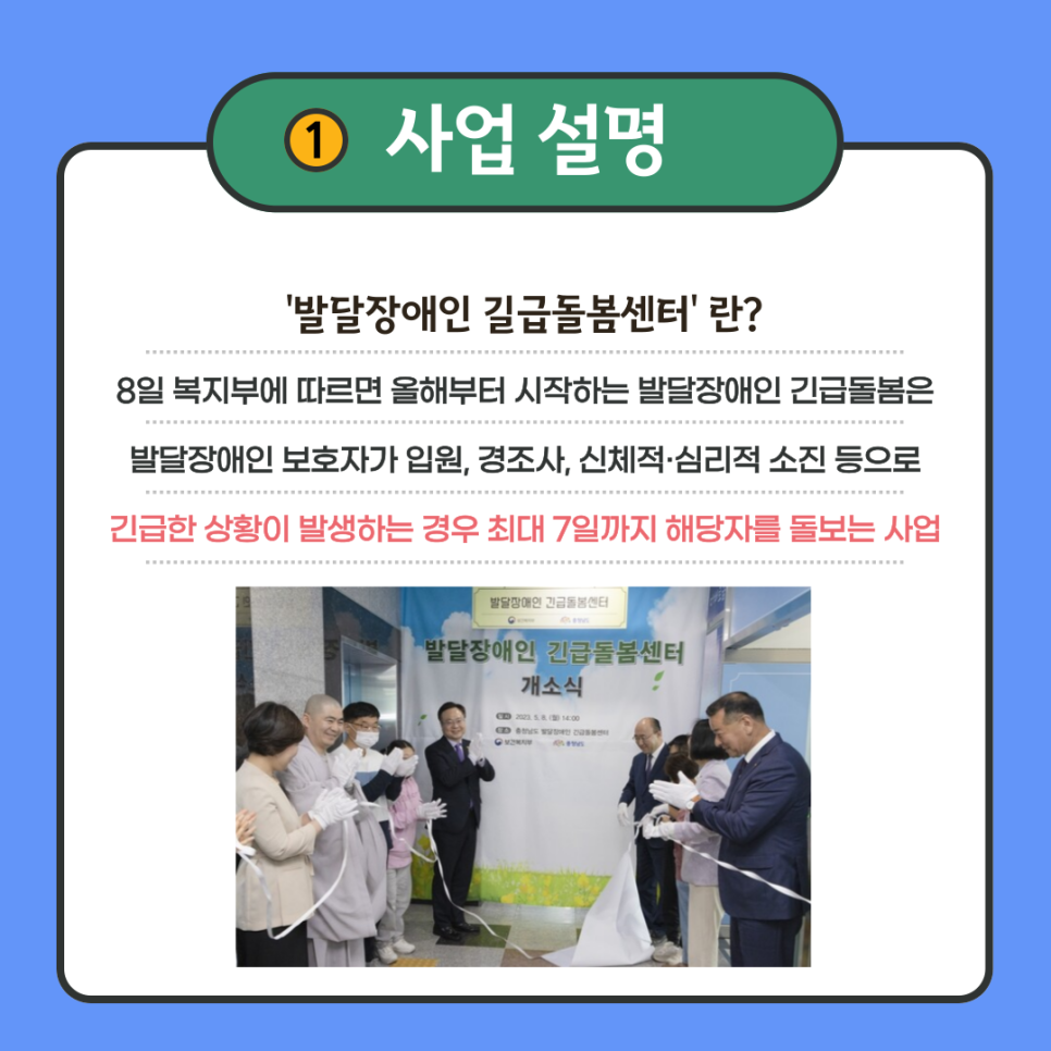 ![]() 안녕하세요~! 드림피플컨설팅입니다~! 오늘은 발달장애인 긴급돌봄센터 운영에 관련된 내용을 가져왔어요~! 올해부터 시작하는 발달장애인 긴급돌봄은 긴급한 상황이 발생하는 경우 최대 7일까지 해당자를 돌보는 사업이라고 해요! 자세한 내용 함께 알아보도록 할까요~? Let's go~!