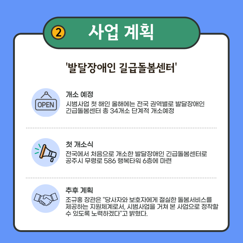 시범사업 첫 해인 올해에는 전국 권역별로 발달장애인 긴급돌봄센터 총 34개소를 단계적으로 개소한다고 해요! 전국에서 처음으로 개소한 발달장애인 긴급돌봄센터는 공주시 무령로 586 행복타워 6층에 마련되어 있다고 합니다! 서비스를 희망하는 분들은 중앙·지역 발달장애인지원센터 누리집에서 사전예약 신청 후, 대상자 선정 안내에 따라 이용가능하다고 하니 서비스가 필요하신 분들은 사전예약 GO GO!