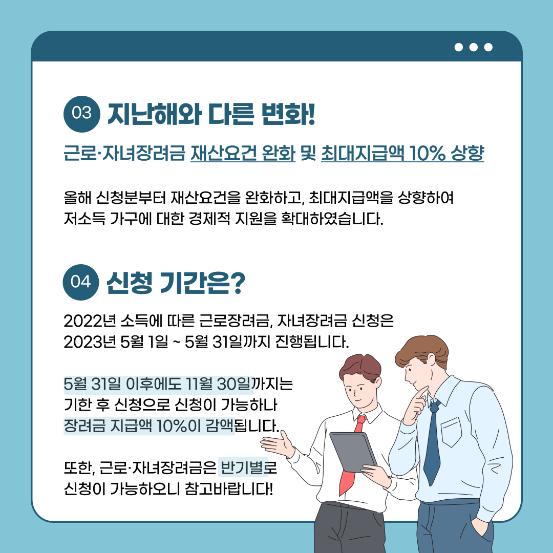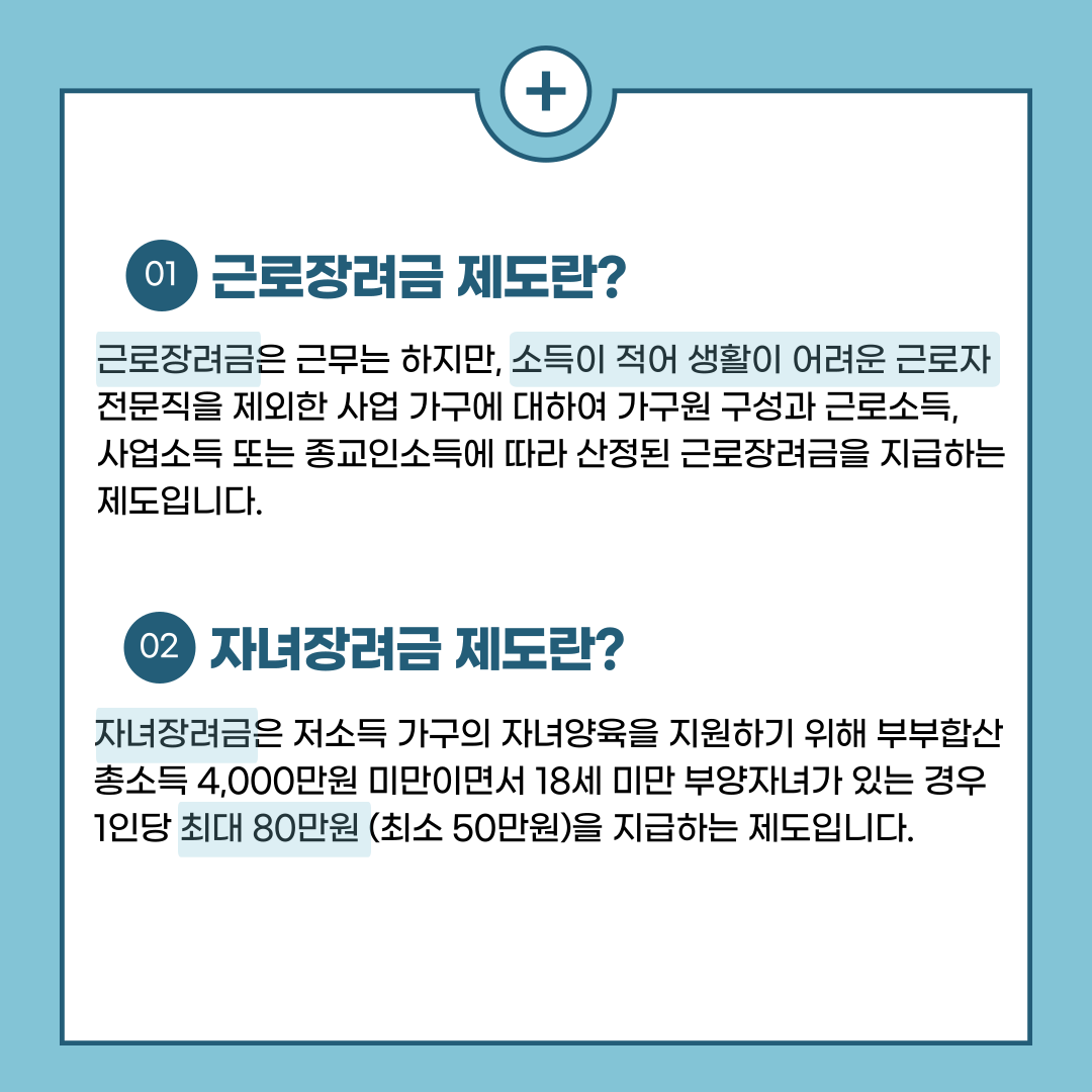 ![]() 안녕하세요~! 드림피플컨설팅입니다~! 오늘은 근로·자녀장려금 제도에 대한 내용을 가져왔어요~! 근로·자녀장려금은 소득이 적어 생활이 어려운 근로자 및 18세 미만 부양자녀가 있는 경우 신청이 가능해요! 자세한 내용은 아래 카드뉴스를 통해 확인해볼까요? Let's go~!