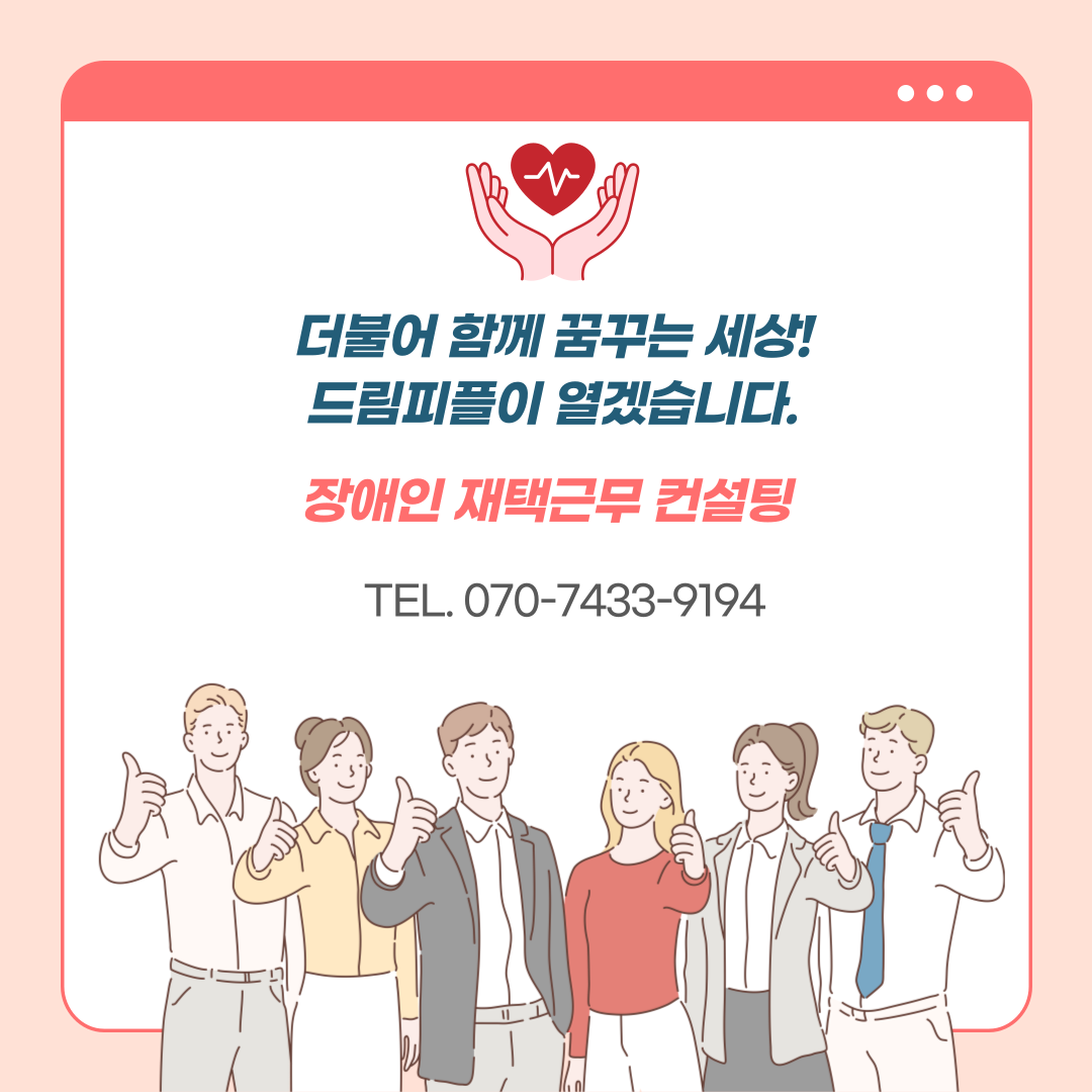 드림피플컨설팅은 여러분과 함께합니다. 더욱 더 도움을 드릴 수 있는 드림피플컨설팅이 되겠습니다! 드림피플은 일자리 부족과 긍정적 인식의 부재라는 고용 현실을 딛고 재택근무를 통해 그 능력에 맞는 직업생활을 통해 경제적 자립을 꿈꾸는 모든 장애인 근로자분들을 원합니다! |