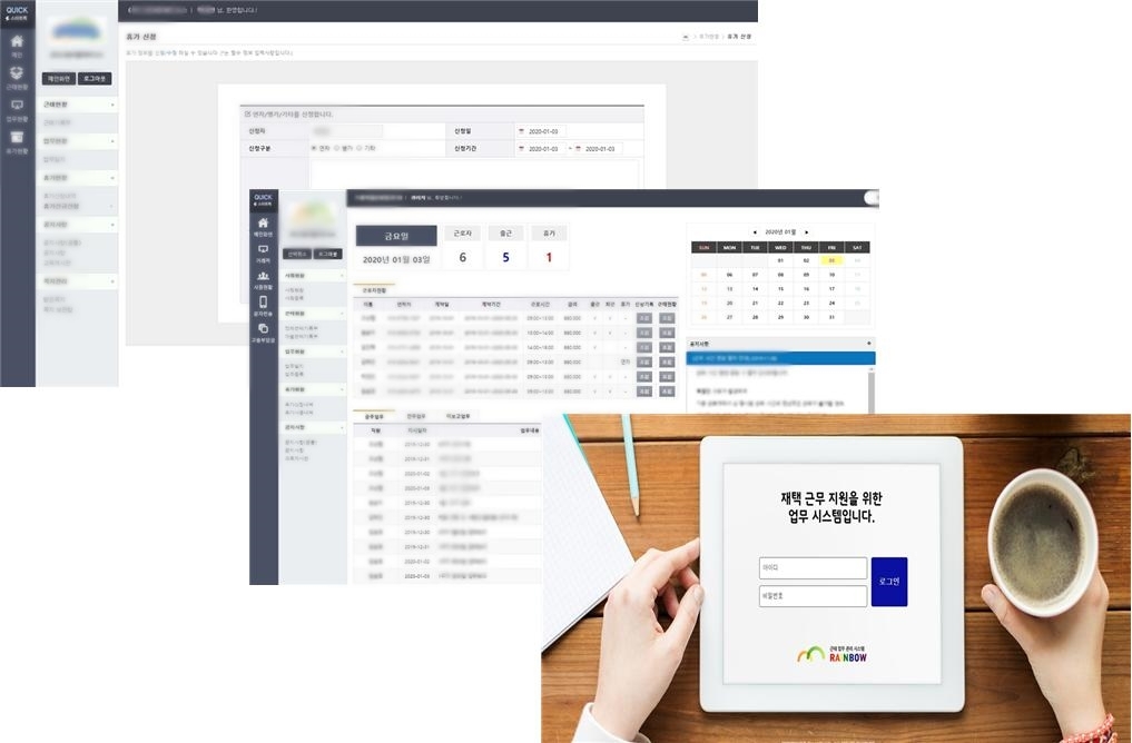기업의 인트라넷과 같은 레인보우시스템을 통해 기업 담당자는 담당자 모드로 진입하여 출퇴근 관리 및 업무 진행과 결재, 반면에 재택근로자 사원은 사원 모드로 진입하여