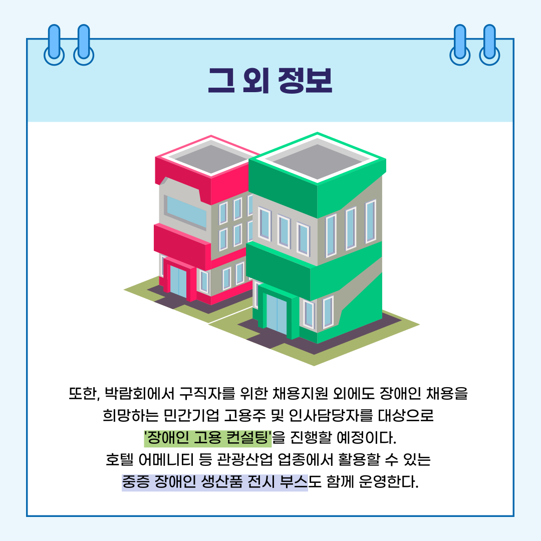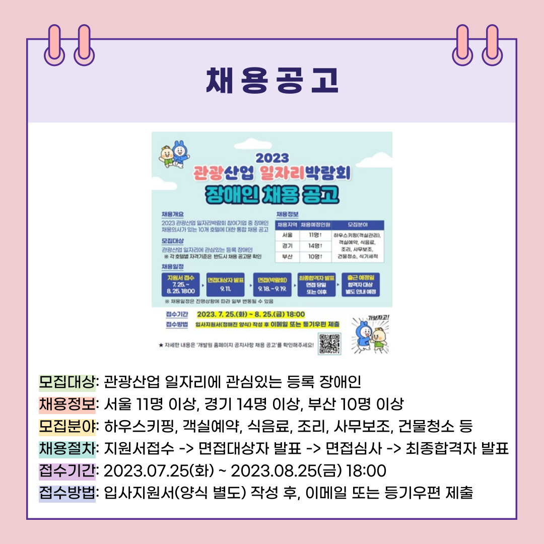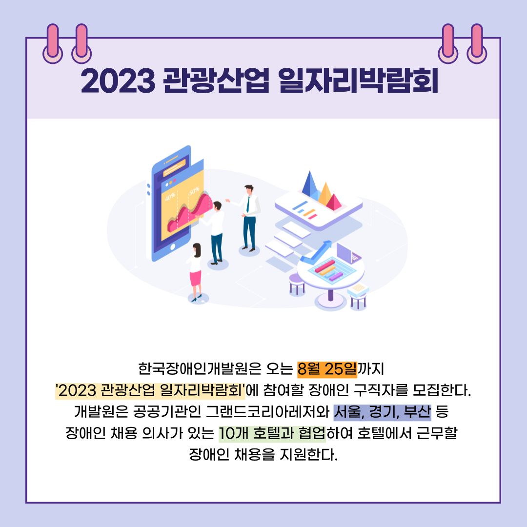 오늘은 2023 관광산업 일자리 박람회에 대한 내용을 가져왔어요~! 7월 25일부터 8월 25일까지 한국장애인개발원이 주최하는 2023 관광산업 일자리박람회가 개최된다고 해요! 그밖에 다른 주요내용은 아래 카드뉴스를 통해 확인해볼까요? Let's go~!